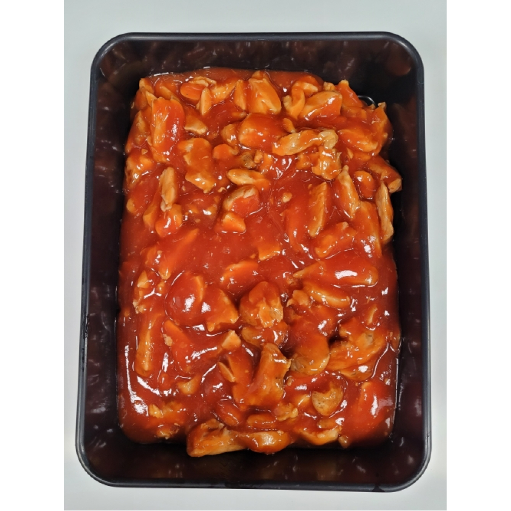Kipdijfilet stukjes gegaard. Gekruid met pangangkruiden en zoete pangangsaus