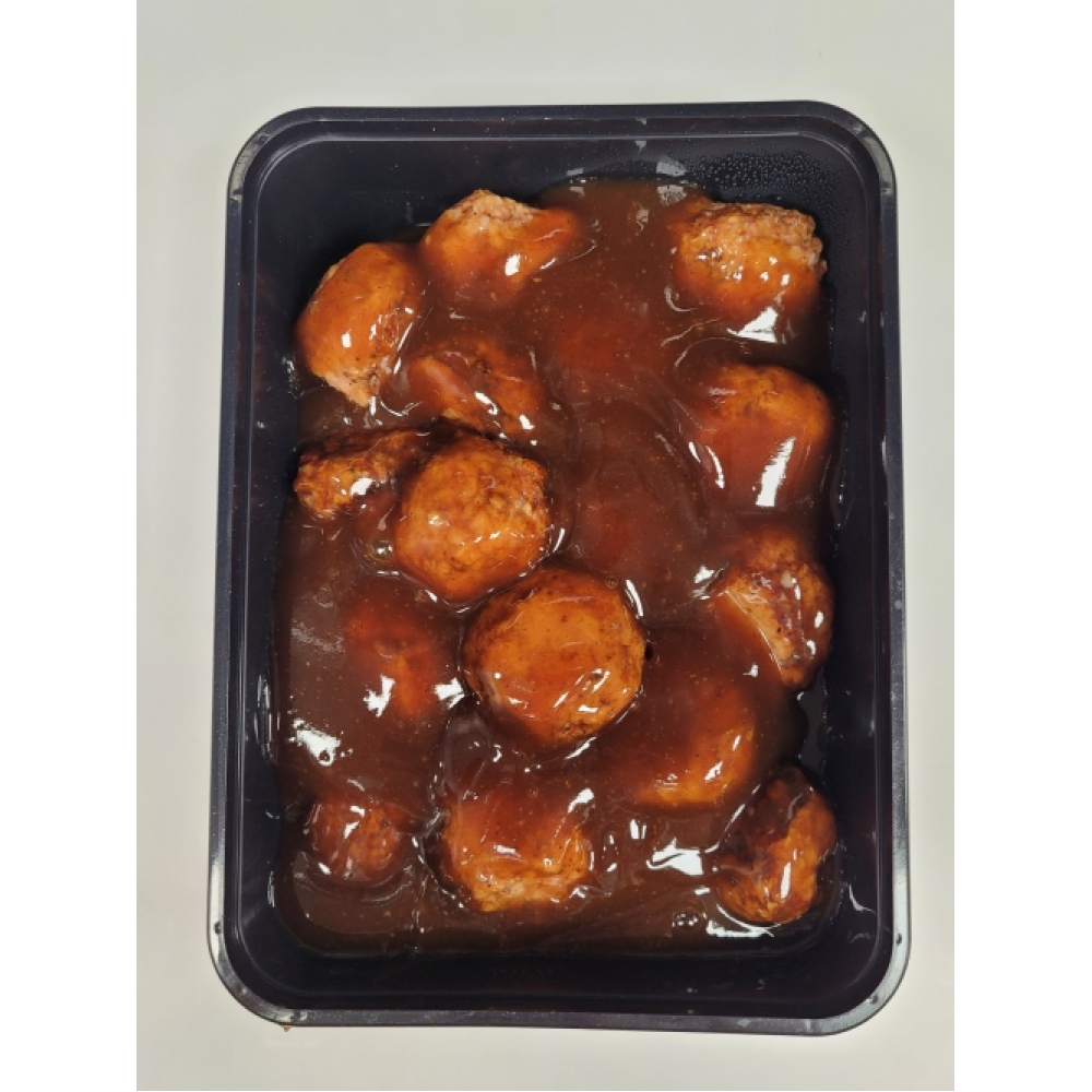 Eigen gemaakte kip/kalkoen gehaktballetjes met currysaus.