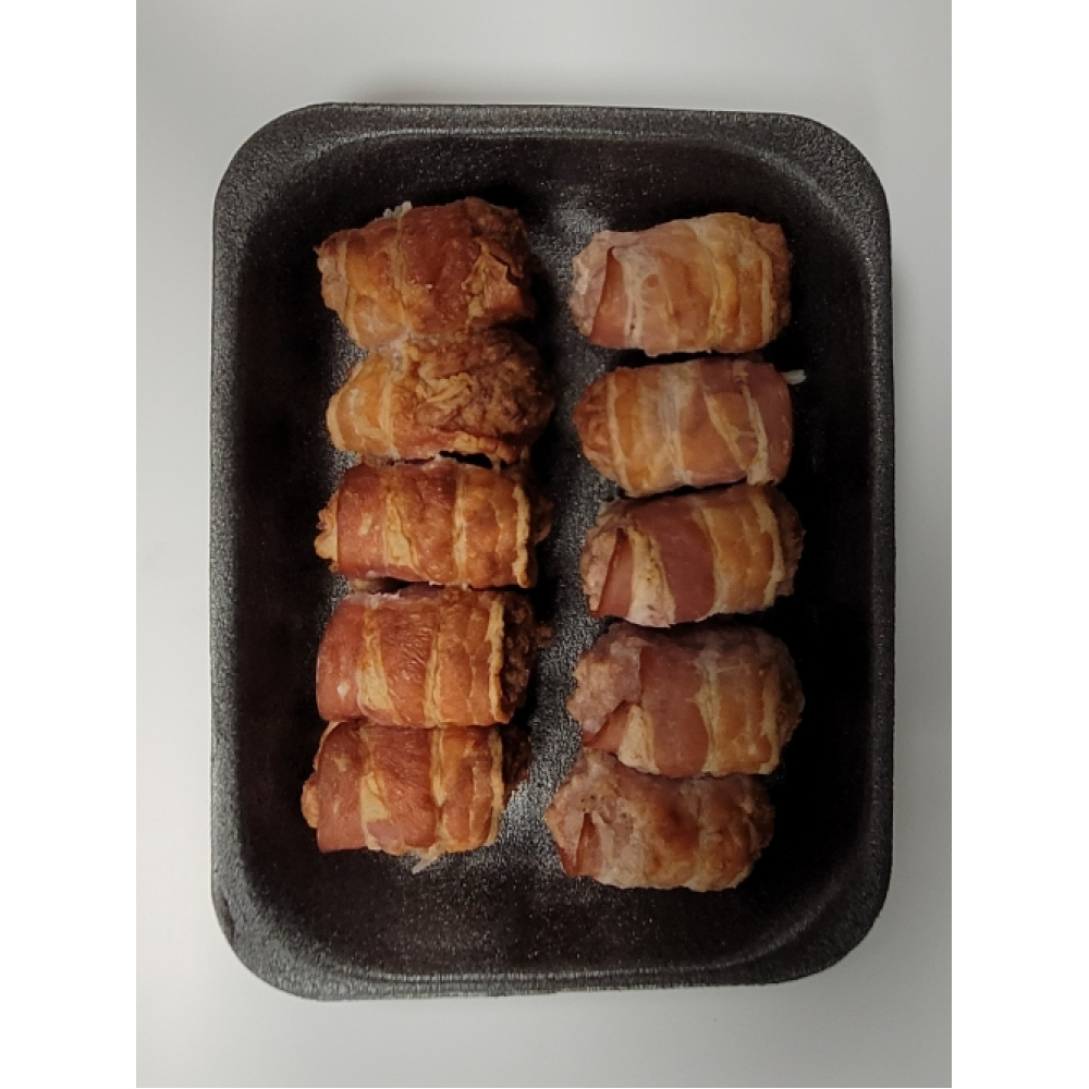 Kipgehakt gerold in spek, kant en klaar hapje.